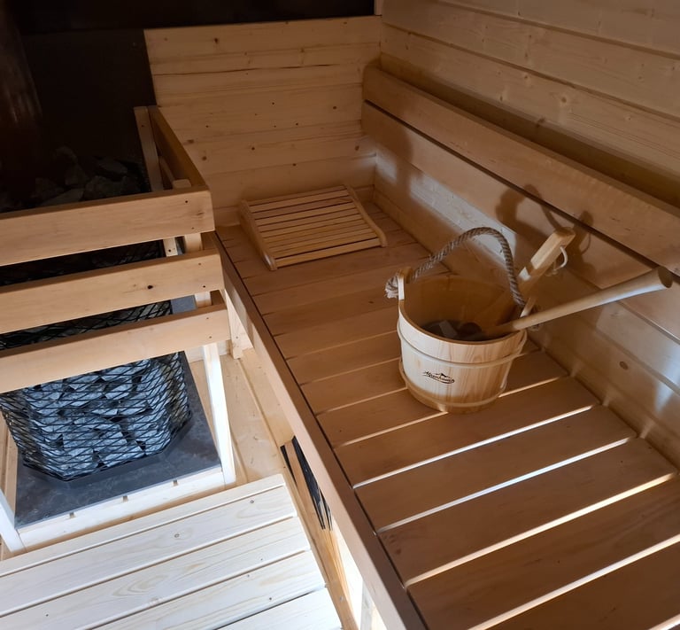 Tolle Düfte, original Regenkelle, hitzefreundlicher Saunaeimer mit Hanfseil, romantische Innen- und Außenbeleuchtung (Stromanschluss wird benötigt), Design Kopfstützen und ein Ofen mit riesigem Steinvorrat für absolut geniale Aufgüsse ohne Kompromisse